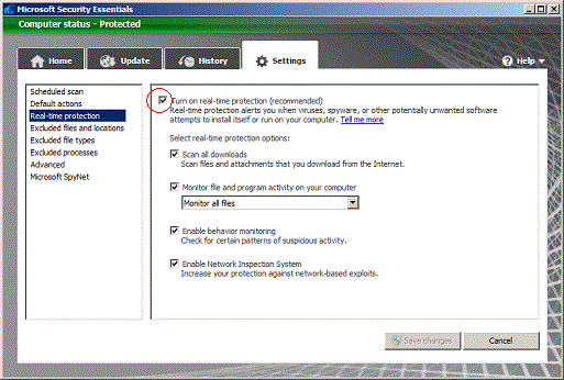 The Solution: In our case, we could get the computer to boot in the “Safe Mode” by repeatedly pressing F8 key after powering on the computer, then selecting “Safe Mode with Networking Support” with the up/down arrows and pressing Enter key. Once booted in “Safe Mode” I could then disable Microsoft Security Essentials, by going into the Start Menu, and clicking Microsoft Security Essentials. Once in the program I went to Settings tab and UNchecked “Run a scheduled scan”, then I went into “real-Time Protection” and UNchecked “Turn-on real-time protection” (see pictures below). We then rebooted normally and the computer runs as good as new!